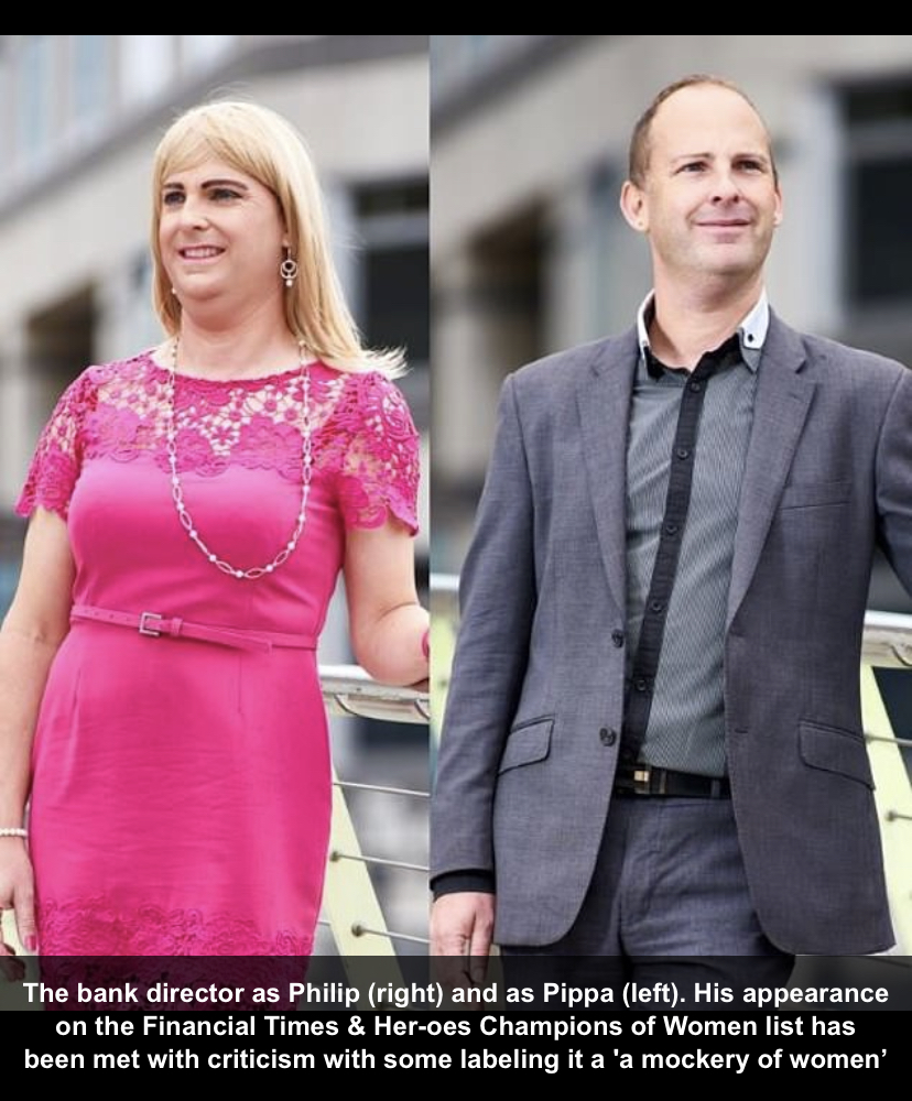 A, și apropo, șeful Credit Suisse este fluid de gen (transsexual) și își împarte timpul „cincizeci și cincizeci” între Pippa și Philip în timp ce era la serviciu. Directorul băncii ca Philip (dreapta) și Pippa (stânga).- https://www.dailymail.co.uk/news/article-6195853/Credit-Suisse-boss-dresses-woman-slammed-appearing-100-women-list.html