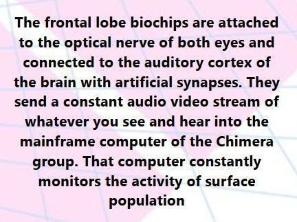 Acele biocipuri ar detecta orice intervenție fizică a Forțelor Luminii la suprafață. Individul contactat ar fi mai întâi foarte fericit, dar frecvența sa vibrațională crescută împreună cu fluxul video/audio de la biocip ar alerta computerul principal Chimera din groapa DARPA.
