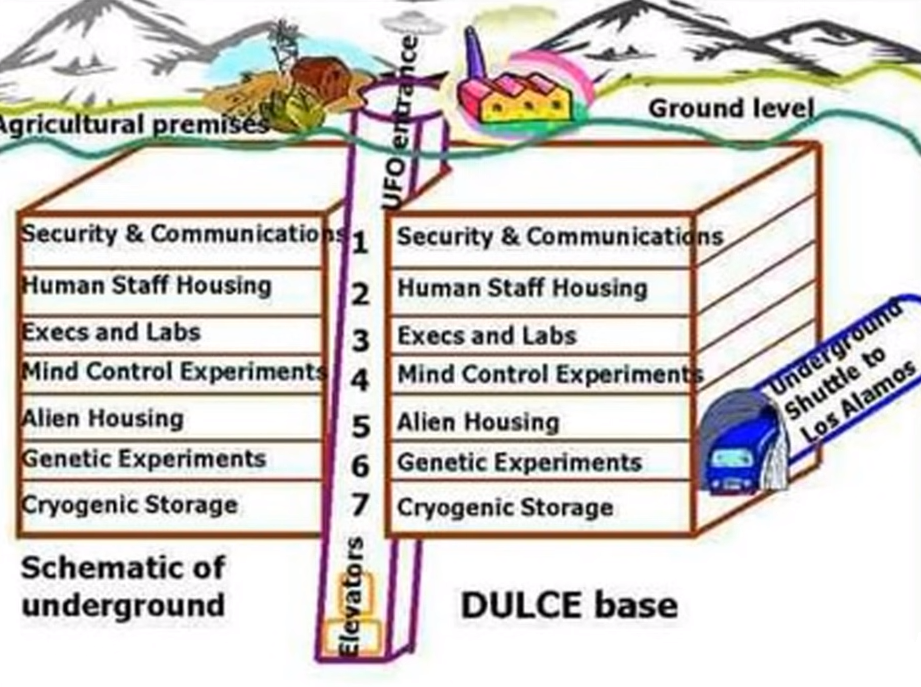 Există Baza Dulce, în New Mexico. Dulce este un oraș mic din nordul New Mexico, situat la peste 7.000 de picioare în rezervația indiană Jicarilla Apache. Există un singur motel major și câteva magazine. Nu este un oraș stațiune și nu este plin de activitate. Dar Dulce are un secret profund și întunecat. Secretul este adăpostit adânc sub stufărișul Archuleta Mesa. Cercetarea funcțiilor legate de minte, experimente genetice, antrenament pentru controlul minții și reprogramare. Există peste 3000 de camere video în timp real în întregul complex în locații de înaltă securitate (intrări și ieșiri). Există peste 100 de ieșiri secrete în apropiere și în jurul lui Dulce. Multe în jurul Archuleta Mesa, altele la sud în jurul lacului Dulce și chiar la est până la Lindrith. Secțiunile adânci ale complexului se conectează în sisteme naturale de caverne.