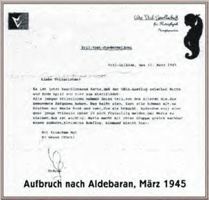 La începutul lunii martie 1945, Societatea Thule a primit o scrisoare, semnată de Maria Orsich, făcând referire la călătoria spre Aldebaran. Se pare că o parte din grupul Vril a făcut deja călătoria și a decis să rămână. Scrisoarea se încheie cu „hier niemand bleibt” – nimeni nu a rămas aici. Dar s-au dus într-adevăr pe o altă planetă?