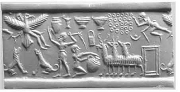 ,,Cu această navă au venit oameni înalți, blonzi cu pielea negricioasă, îmbrăcați în alb, care s-au declarat a fi frumoși ca Zeii. L-au invitat pe regele Etana să vină cu ei, consilierii regelui Etana încercând să-l descurajeze să meargă în interiorul obiectului zburător. Într-un vârtej de flăcări și fum, el a crescut la fel de mare ca Pământul cu mările, insulele și continentele păreau un coc într-un coș, apoi a dispărut din vedere”.