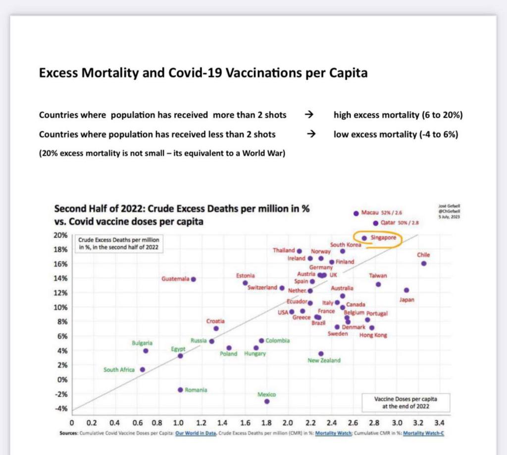 Cititorii pot ajuta în acest proces depunând personal acuzații de crimă împotriva oficialilor implicați în promovarea vaccinurilor în jurisdicțiile lor locale de poliție. Poliția va fi forțată să acționeze odată ce li se va dovedi că vaccinurile sunt dăunătoare și nu protejează împotriva COVID. Graficul de mai jos arată, de exemplu, țările care și-au vaccinat populațiile de mai mult de două ori, au avut o mortalitate în exces variind de la 6 la 20%. Cel mai mare studiu de autopsie din lume a dezvăluit statistica șocantă conform căreia 73,9% dintre decesele în rândul „vaccinaților” sunt cauzate de vaccin. Țările care nu au vaccinat au avut rate normale de mortalitate.- https://rumble.com/v3hwcgm-dr.-mcculloughs-speech-at-the-european-parliament.html