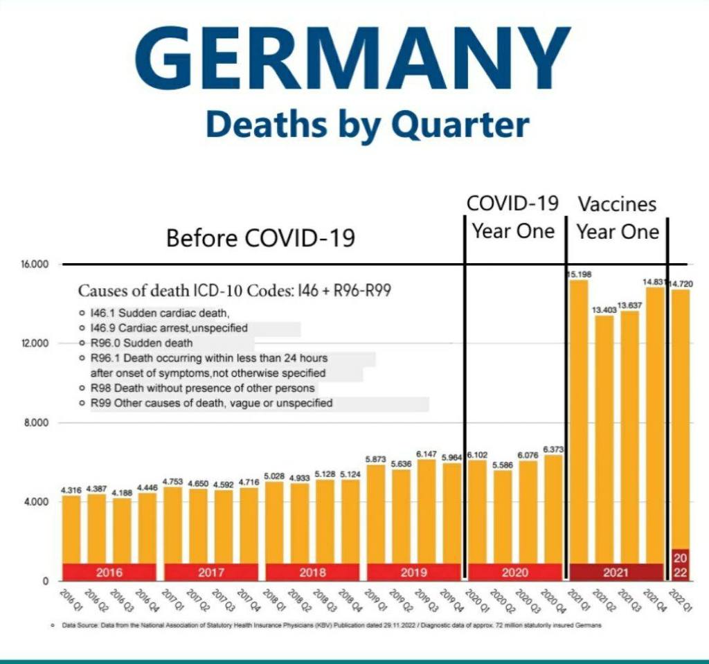 Graficele de mai jos arată excesul de mortalitate în Germania și Japonia în urma campaniei de injecție forțată. Cifre similare sunt observate în alte țări, cum ar fi Canada și Statele Dezlegate (greșeli de scriere deliberate).