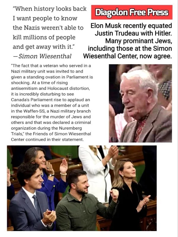 Trudeau și-a dovedit vinovăția invitându-l pe Jaroslaw Hunka, un nazist SS din Galiția, să se adreseze Parlamentului canadian în aplauze mari. Trupele lui Hunka au fost responsabile pentru cel puțin 1,5 milioane de morți în Ucraina în timpul celui de-al Doilea Război Mondial. În caz că nu știți, Adolf Hitler a scris în Mein Kampf că a vrut să înrobească și apoi să omoare 90% din umanitate. Cu alte cuvinte, naziștii erau evrei de Sabat-Franchiști, sau ceea ce este acum cunoscut sub numele de mafia Khazară. Centrul pentru Israel și Afaceri Evreiești, care reprezintă asociațiile evreiești din întreaga țară, a declarat că este profund deranjat de incident. Cu toate acestea, în semn că mulți dintre ei sunt încă spălați pe creier, ei au adăugat: „Comunitatea evreiască din Canada este ferm alături de Ucraina în lupta sa împotriva agresiunii ruse”.