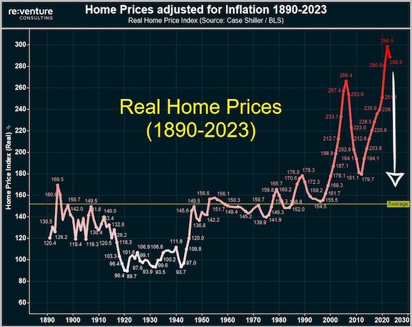 Proprietarii americani au și ei probleme. Vânzările de case în octombrie au scăzut la cel mai scăzut nivel de când Asociația Națională a Agenților Imobiliari a început să le urmărească în 2001. Într-un semn bogații sunt singurii care beneficiază de sistemul actual, doar vânzările de case cu prețuri peste 750.000 de dolari au crescut. Graficul de mai jos arată că prețurile caselor din SUA trebuie să scadă la jumătate din prețul actual pentru a ajunge la media istorică.