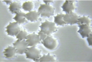 Când un globul roșu are defecte și începe să moară, ele pot dezvolta ceva numit formare de acantocite, unde mai multe proiecții țepoase de lungimi diferite ies din celulă. Imaginile de mai jos arată cum arată când o celulă din sânge moare.