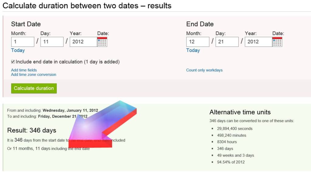 Deci, am fost curios cât timp a fost între data din 11 ianuarie 2012 și 21 decembrie 2012, așa că m-am dus on-line și am găsit acest lucru: