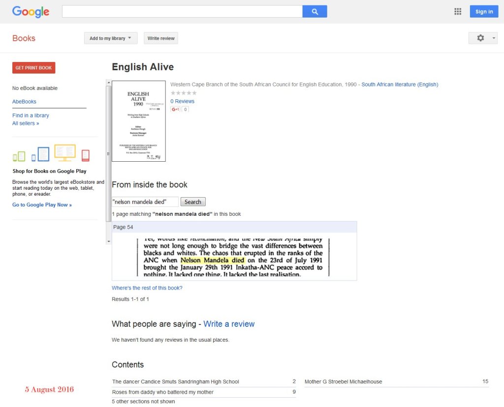 Dacă veți căuta pe Google “Western Cape Branch of the South African Council for English Education, 1990 – South African literature (English)”, se specifică faptul că Nelson Mandela a murit în 23 iulie 1991.