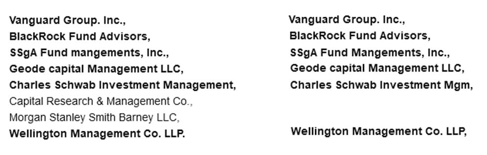 Comparația celor două liste relevă faptul că ambele firme au acționari comuni și nu oricare, ci unele din cele mai mari fonduri mondiale de investiții, care se regăsesc ca acționari, de asemenea, la cele mai mari companii din lume, cum spuneam și la începutul acestui articol, din cele mai diferite domenii, de la industria alimentară, la cea de armament.