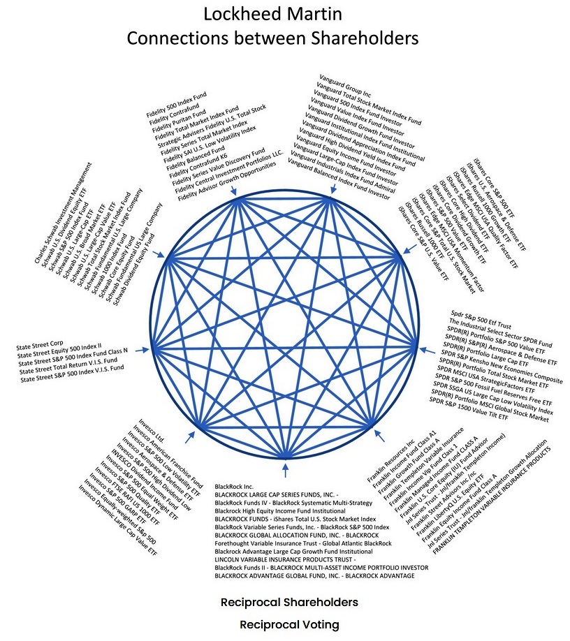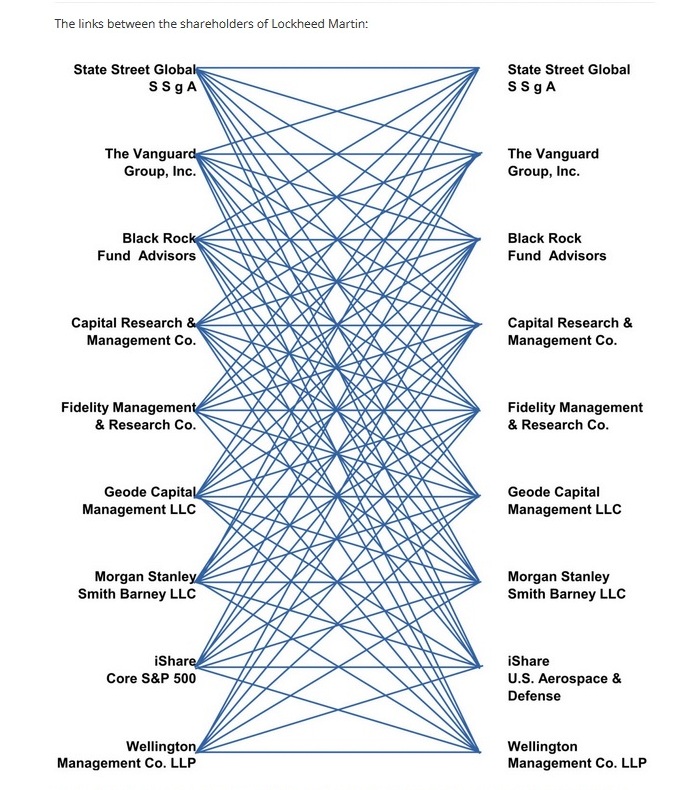 Am arătat și în ediția de săptămâna trecută, o spunem și astăzi. Acționare la aceste Companii americane de tehnologie militară, aeronave, armament nuclear și elemente auxiliare, sunt peste 30 de alte companii multinaționale și Fonduri mutuale care, la rândul lor, au fiecare în parte, ca acționare alte 10 până la 20 de alte firme derivate din firma mama, de obicei și cu numele original inclus în denumirile lor, atenție!, companii și fonduri mutual care nu doar că sunt acționare unele la altele și se întrepătrund ca întro-uriașă suveică (schema mai jos), dar sunt aceleași care sunt acționare și la alte companii uriașe din alte domenii.
