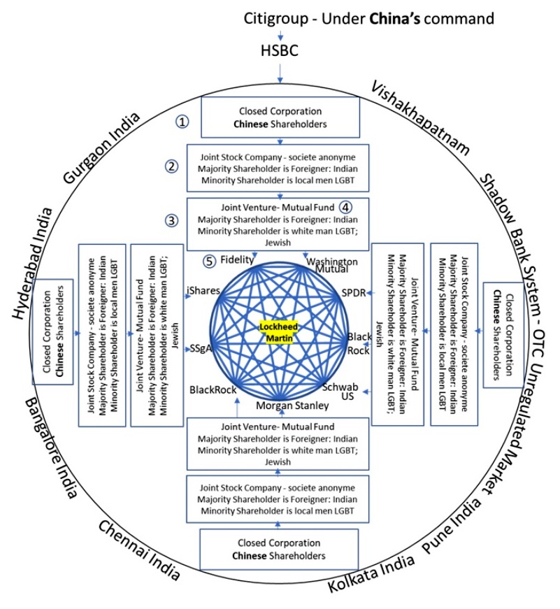 Printr-o rețea uriață de firme jucătoare pe piața bursieră a lumii, prin cele două cordoane de off-shore-uri, cea din Sudul Asiei și cea din Arhipelagul Caraibian, printr-o armată 5-600 de mandatari și brokeri Secta a reușit să creeze sau să se infiltreze, după caz, în marile companii multinaționale despre care tot facem referire, cât și la conducerea acestor, în Consiliile de Administrație. Și vom exemplifica cele spuse anterior prin modelul de acționariat al firmei americane Lockheed Martin, companie americană și constructor aerospațial de prim rang, specializată în domeniul militar, al securității și al tehnologiilor avansate.