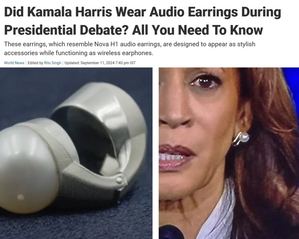 Aceasta este aceeași Kamala care spune „Visul american este evaziv… pur și simplu nu este de fapt atins”. MK a încercat să-i păcălească pe americani să susțină această groază cu o dezbatere trucată pe ABC. Surse ale pălăriilor albe din agenții spun că analiza lor asupra dezbaterii a arătat că ea a primit răspunsuri prin microfoane deghizate în cercei. Uită-te la cerceii purtați de Kamala Harris la dezbatere.