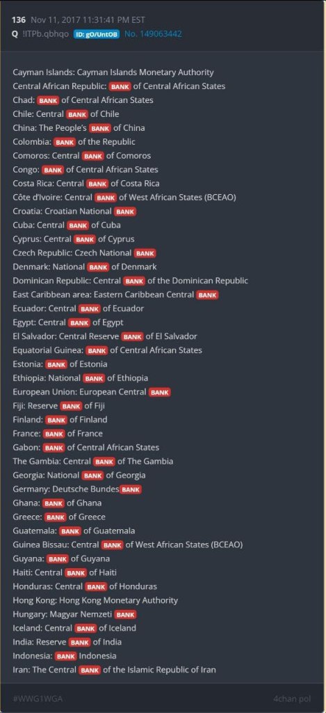 Lista țărilor pe care nu le controlează este mult mai scurtă. Bhutan, Myanmar și Coreea de Nord sunt singurele pe care le-am putut identifica ca nefiind sub controlul lor. Faptul că Q a postat lista băncilor centrale Rothschild și Elon Musk X a arătat că forțele spațiale americane sunt conștiente de natura cu care se confruntă.