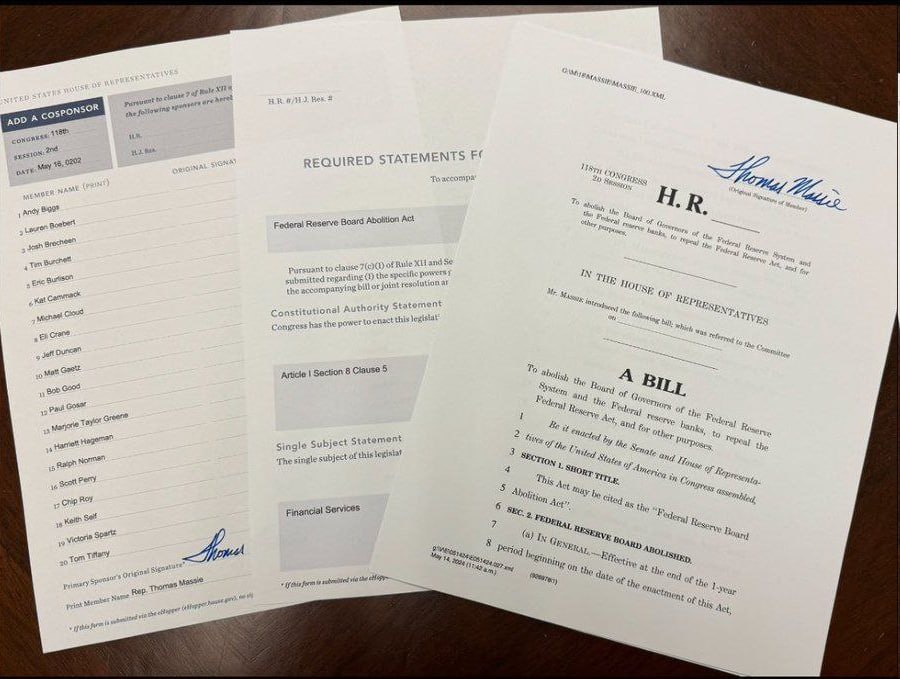 De aceea există un alt proiect de lege care trebuie adoptat și el. Este H.R. 8421 al reprezentantului Thomas Massies, Legea privind eliminarea Consiliului Rezervei Federale. Legislația reprezentantului Massie desființează Consiliul Guvernatorilor Rezervei Federale și băncilor Rezervei Federale. De asemenea, abrogă Federal Reserve Act, legea din 1913 care a creat Sistemul Rezervei Federale.