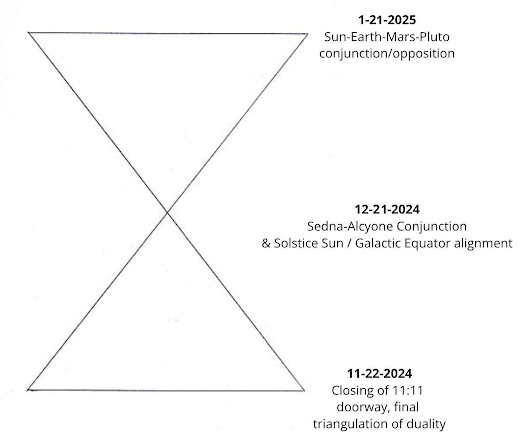 Acel Portal se va deschide pe 22 noiembrie odată cu închiderea orei 11:11, va avea punctul de cotitură pe 21 decembrie cu conjuncția Sedna Alcyone și se va închide pe 21 ianuarie cu Pământul heliocentric conjuncționând cu Marte, ambii opunându-se lui Pluto.