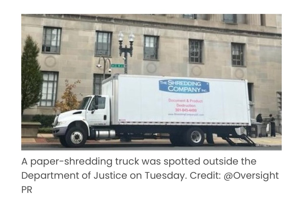 Trump trebuie să ia măsuri pentru că, pe lângă încercarea de a începe războiul mondial, MK se grăbesc să ascundă dovezile crimelor lor. Camioane tocătoare au fost observate în fața Departamentului de Justiție. Acest lucru arată că tocătoarele din interiorul clădirii sunt copleșite de cantitatea mare de dovezi care sunt tocate.