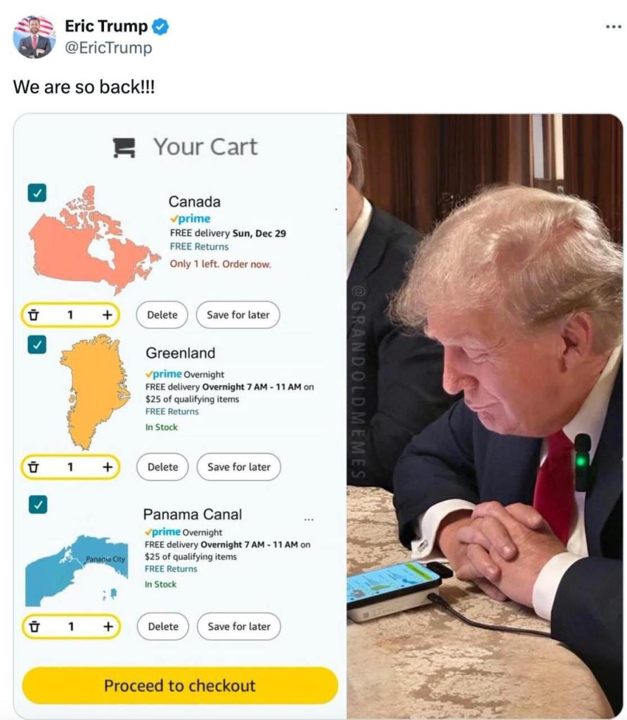 De asemenea, guvernatorului Justin Trudeau al Canadei, ale cărui taxe pentru cetățeni sunt mult prea mari, dar dacă Canada ar deveni al 51-lea stat al nostru, impozitele ar fi reduse cu peste 60%, afacerile lor s-ar dubla imediat și ar fi protejate militar ca nicio altă țară din lume. La fel, oamenilor din Groenlanda, care au nevoie de Statele Unite în scopuri de securitate națională și care doresc ca SUA să fie acolo, și vom fi.