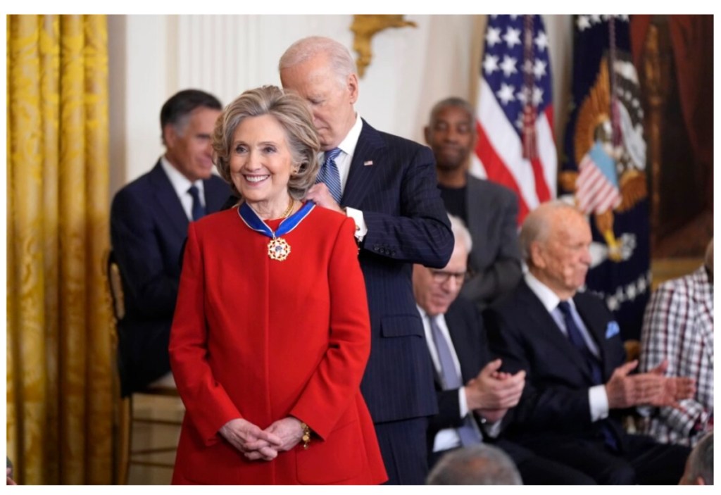 În ceea ce face, de asemenea, aproape sigur parte din psiop-ul militar, o tânără falsă și slabă Hillary Clinton și un George Soros decedat au primit „Medalia Libertății” de la „Președintele Joe Biden”. Spectacol hilar…