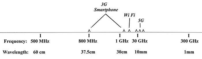 Un smartphone care operează la 800 MHz, de exemplu, trimite și primește semnale cu lungimi de undă de 37,5 centimetri (puțin sub 15 inci). Funcționând la 1,9 GHz, lungimile de undă sunt de 16 centimetri (puțin peste 6 inci). WiFi folosește banda de frecvență de 2,4 GHz cu lungimi de undă de 12 centimetri (puțin sub 5 inci lungime). Introducerea 5G va presupune utilizarea unor frecvențe considerabil mai mari decât acestea, cu lungimi de undă corespunzător mai mici (deasta trebuie mai mulți stâlpi cu emițătoare de retransmisie a semnalului, n.b.). Peste 30 GHz, lungimile de undă sunt doar milimetrice. Banda de undă milimetrică (de la 30 GHz la 300 GHz) este denumită Frecvență Extrem de Înaltă, iar lungimile de undă ale acesteia sunt cuprinse între 10 milimetri și 1 milimetru lungime. Până în prezent, radiațiile electromagnetice de înaltă frecvență nu au fost propagate pe scară largă, iar introducerea sa marchează o schimbare semnificativă a pasului în tipul de energie electromagnetică care va deveni prezentă în mediul natural.