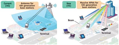 Pe lângă faptul că sunt distanțate mai strâns, micro-celulele 5G vor funcționa cu o putere mult mai mare decât stâlpii de telefonie pentru a se asigura că semnalele sunt suficient de puternice. Deoarece lungimile de undă sunt mult mai mici, antenele care le transmit și le primesc vor fi, de asemenea, mult mai mici decât cele ale stâlpilor telefonici actuali și ale dispozitivelor electronice. Un singur transmițător / receptor 5G va avea un număr mare de antene minuscule, grupate într-o singură unitate. O serie de puțin peste o mie de astfel de antene măsoară doar patru centimetri pătrați, astfel încât se va încadra cu ușurință într-o stație de bază mică de pe un stâlp, în timp ce smartphone-ul din buzunar va avea probabil șaisprezece.