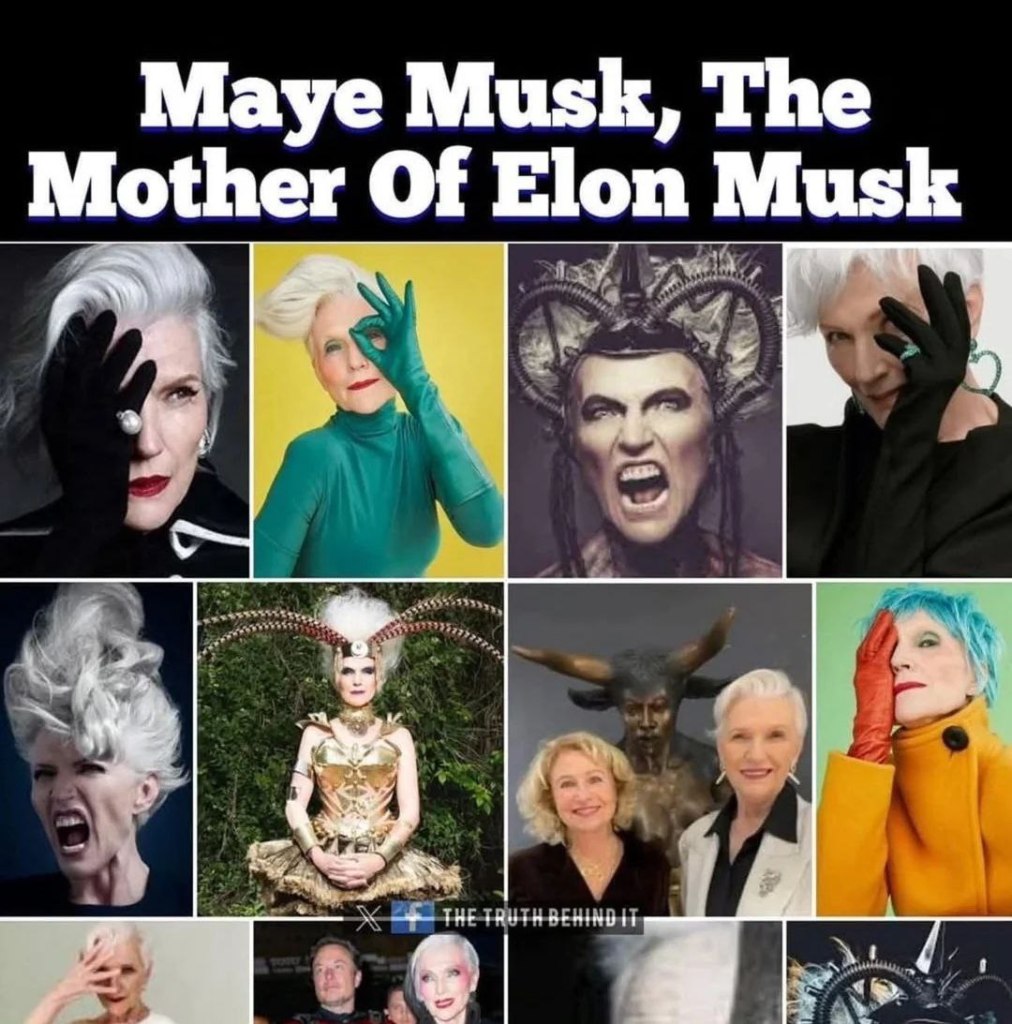 Cu siguranță există și un nou Musk. Musk inițial a cerut un „MAGA gotic întunecat” și încerca să-și transforme platforma, X, într-un sistem de control Mark of the Beast integrat cu criptomonede, implanturile sale cerebrale Neuralink și o rețea de satelit Starlink care se întinde pe planetă. Fotografia de mai jos o arată pe mama satanică a bătrânului Musk.