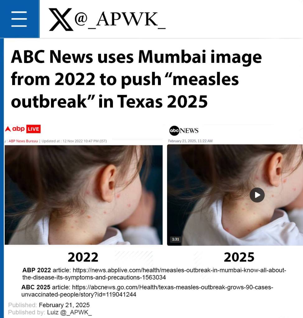 Avem, de asemenea, o mulțime de dovezi că mass-media de propagandă corporativă folosește minciuni care generează frică pentru a încerca să păcălească oamenii să ia aceste vaccinuri toxice. În cel mai recent exemplu, ABC News folosește o imagine din Mumbai din 2022 pentru a împinge „focarul de rujeolă” din Texas în 2025. Nimic nu descrie FARSA mai bine ca fotografiile false din știrile principale.