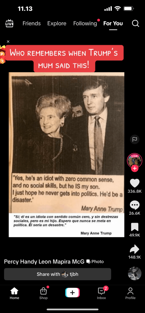 „Da, este un idiot fără bun simț și fără abilități sociale, dar ESTE fiul meu. Sper doar să nu se apuce niciodată de politică. Ar fi un dezastru.” Mary Anne Trump.