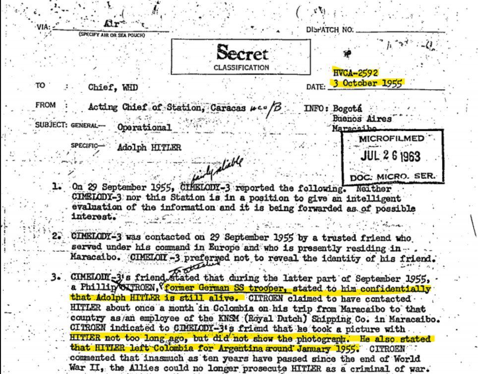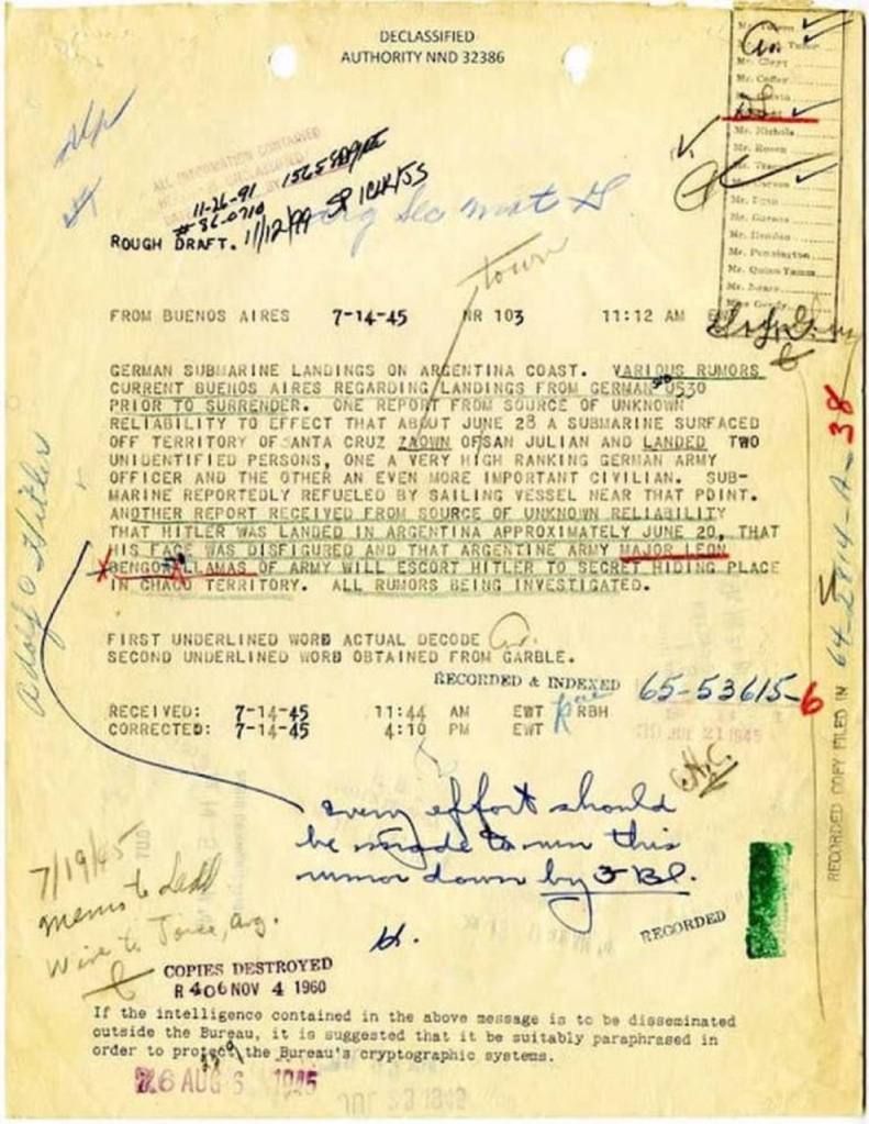 Cu privire la dispariţia lui Hitler, faptele sunt neclare. Miguel Serranos, ambasadorul Republicii Chile la Viena, povesteşte că loja a 99-a l-a ajutat pe Hitler să fugă în America Latină. În 5 martie 1979 unele ziare au scris că s-a găsit avionul său personal în America de Sud. Inginerul austriac de aviaţie Joseph Greiner a publicat în Elveţia în 1945 o carte unde afirmă că la văzut personal pe Hitler îmbarcându-se într-un avion la Berlin Tempelhof la ora 2 după amiază pe 30 aprilie 1945.