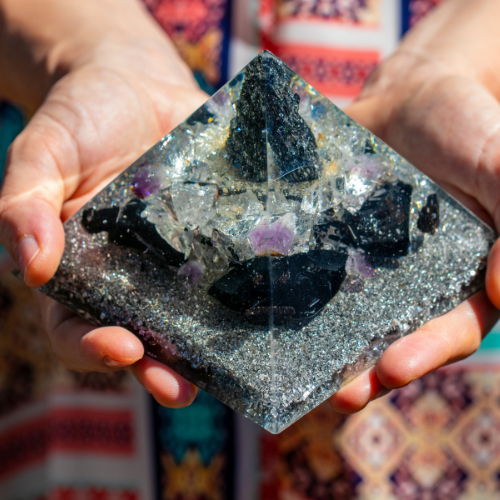 Cristalul de turmalin negru – Este utilizat adesea în orgonite pentru protectia împotriva energiilor negative si a radiatiilor electromagnetice. Este cunoscut pentru capacitatea sa de a transmuta energiile negative în energii pozitive si de a ajuta la eliminarea blocajelor energetice.