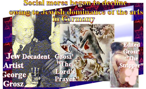 Moravurile sociale au început să decadă datorită dominației evreiești a mass-media și artelor, promovând perversiunea sexuală și pornografia. Un artist de frunte al timpului a fost evreul și comunistul spartakist, George Grosz, cunoscut pentru picturile sale pornografice. (Autorul articolului:.. Sună precum Israelul khazar de astăzi; nu-i pornografia una din cele mai mari afaceri de miliarde de dolari ale Israelului? Acest lucru merge împreună cu prostituția legalizată. Cele mai mari industrii ale Israelului sunt perversiunea și războiul, aceasta sună ca o națiune cu adorare luciferică.).